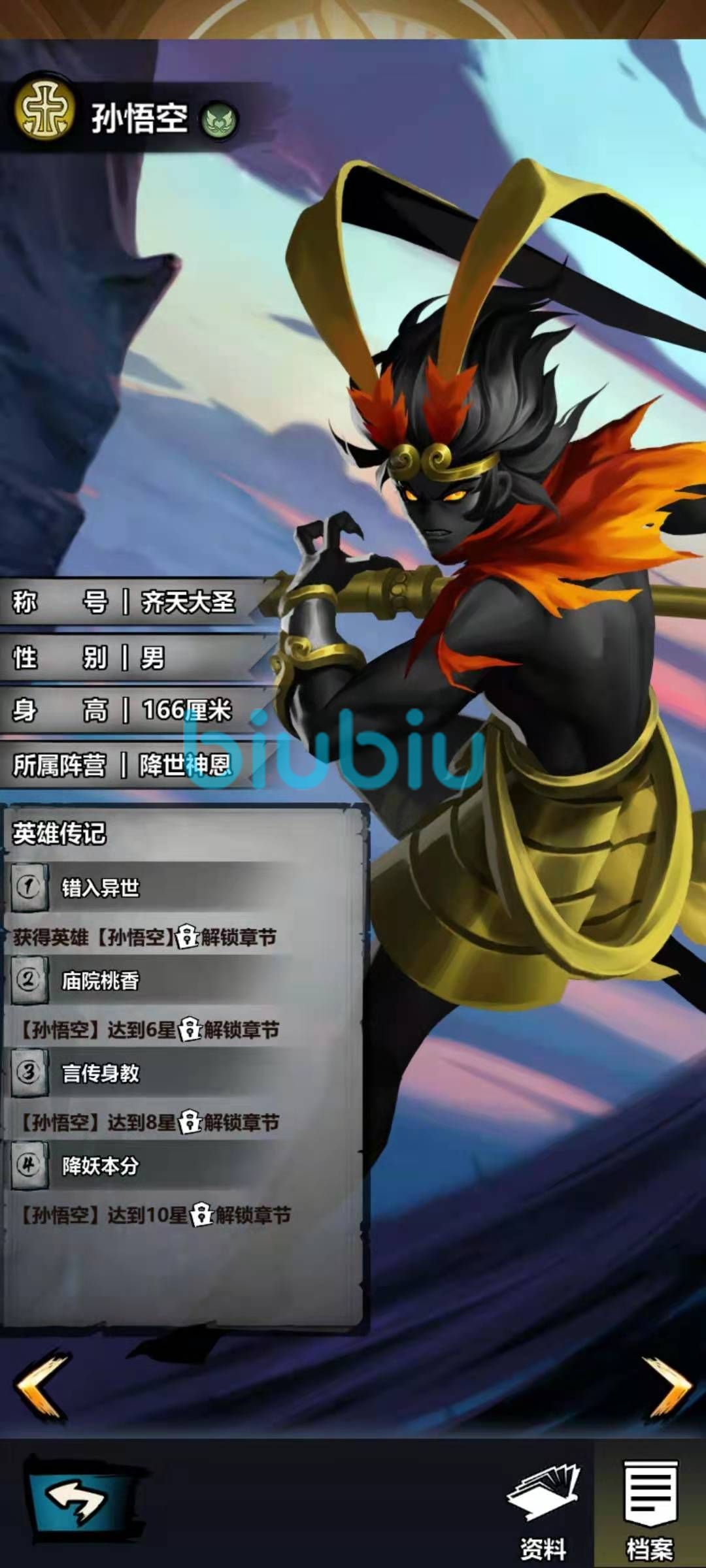 孙悟空是属于神恩阵营中的一名英雄,系统给出的定位是擅长物理群攻伤害,主动技能的效果是伤害敌方英雄数量最多的一列,并且降低伤害目标的防御力,提升孙悟空自身和另一个攻击力最高的己方英雄的速度。必杀技是一个群体伤害,能够分出分身去攻击敌方全体角色。这两个技能从伤害的数值和效果来看,孙悟空不愧是最强输出之一。