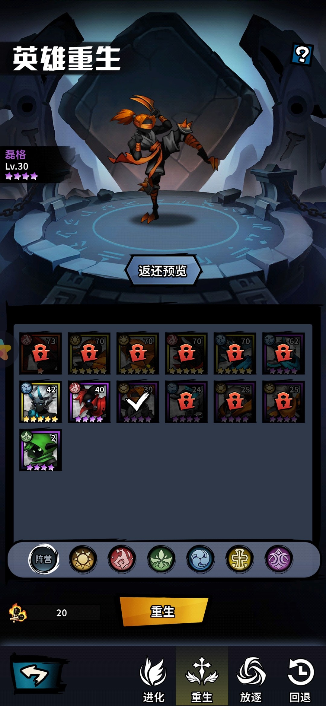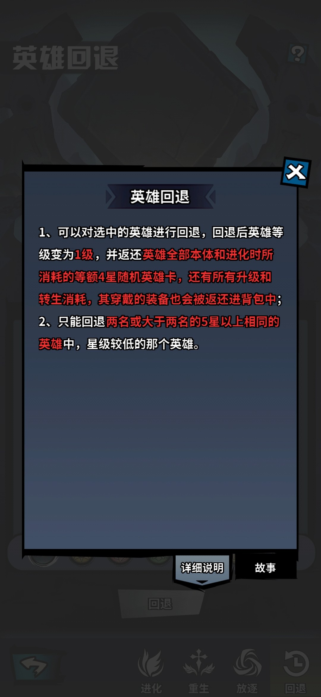 1、可以对选中的英雄进行回退,回退后英雄等级变为1级,并犯坏英雄全部本体和进化时所消耗的等额4星随机英雄卡,还有所有升级和转生消耗,其穿戴的装备也会被返还进背包中;