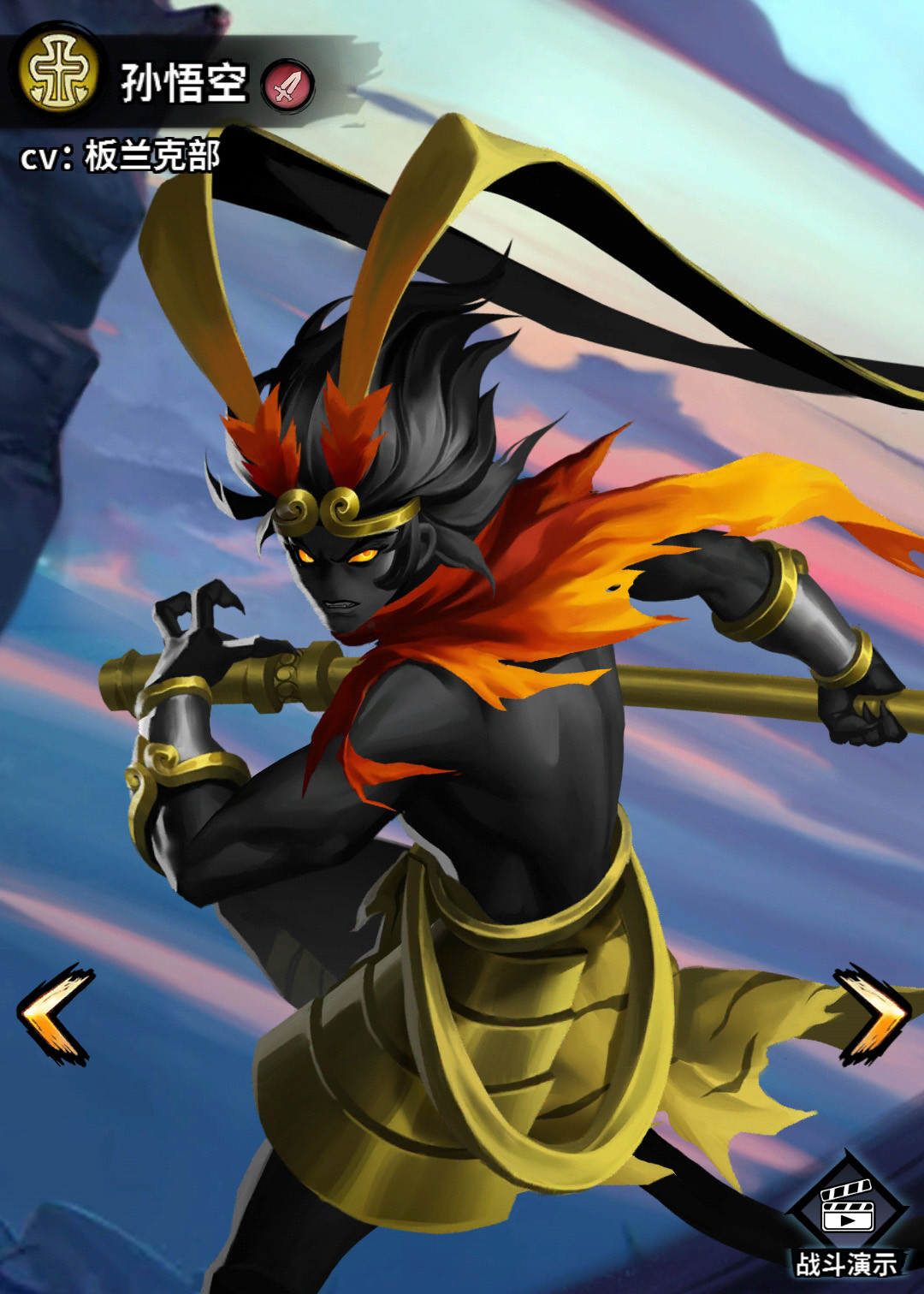 属于强攻系,定位为物理群攻,两个物群技能,可以降低目标防御,并提高自身和己方攻击最高10%的速度。此外当其生命值降低到一定比例时,被动技能有三次回血的机会,第三次回血后,会自动释放一次群攻技能。总体来看,孙悟空能输出,生存能力也较强。