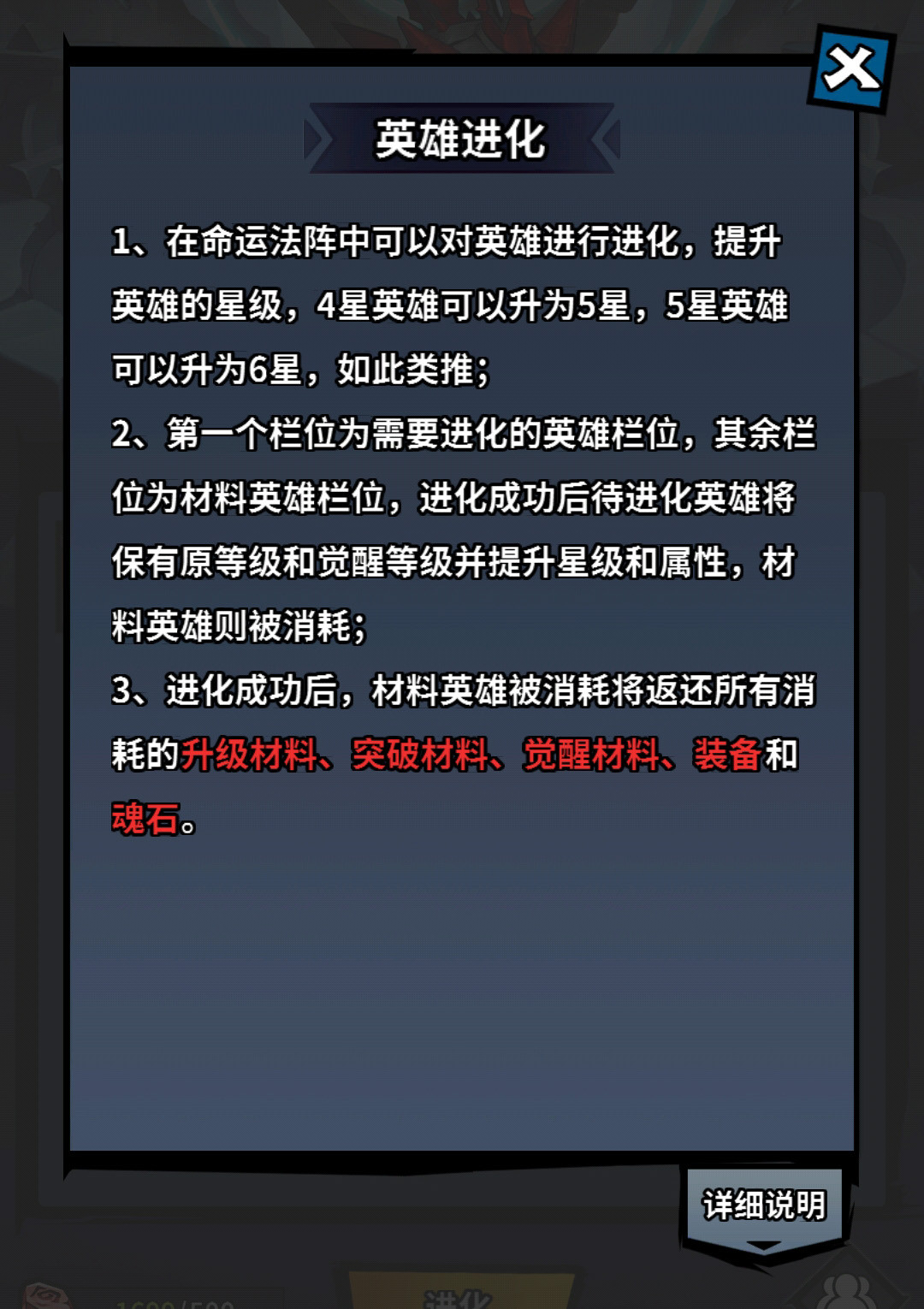 升星成功后,材料英雄被消耗,将返还所有消耗的升级材料、突破材料、觉醒材料、装备和魂石。