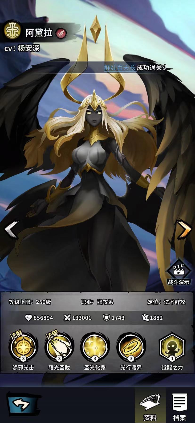 阿黛拉一共有4个技能以及一个被动效果,被动效果为觉醒之力,在战斗的第三回合将自动触发,可提升自身30%的攻击以及15%的暴击率,持续时间为4回合,这个被动效果也是游戏内传奇英雄的固有特性,可以最大限度提升传奇英雄的伤害。