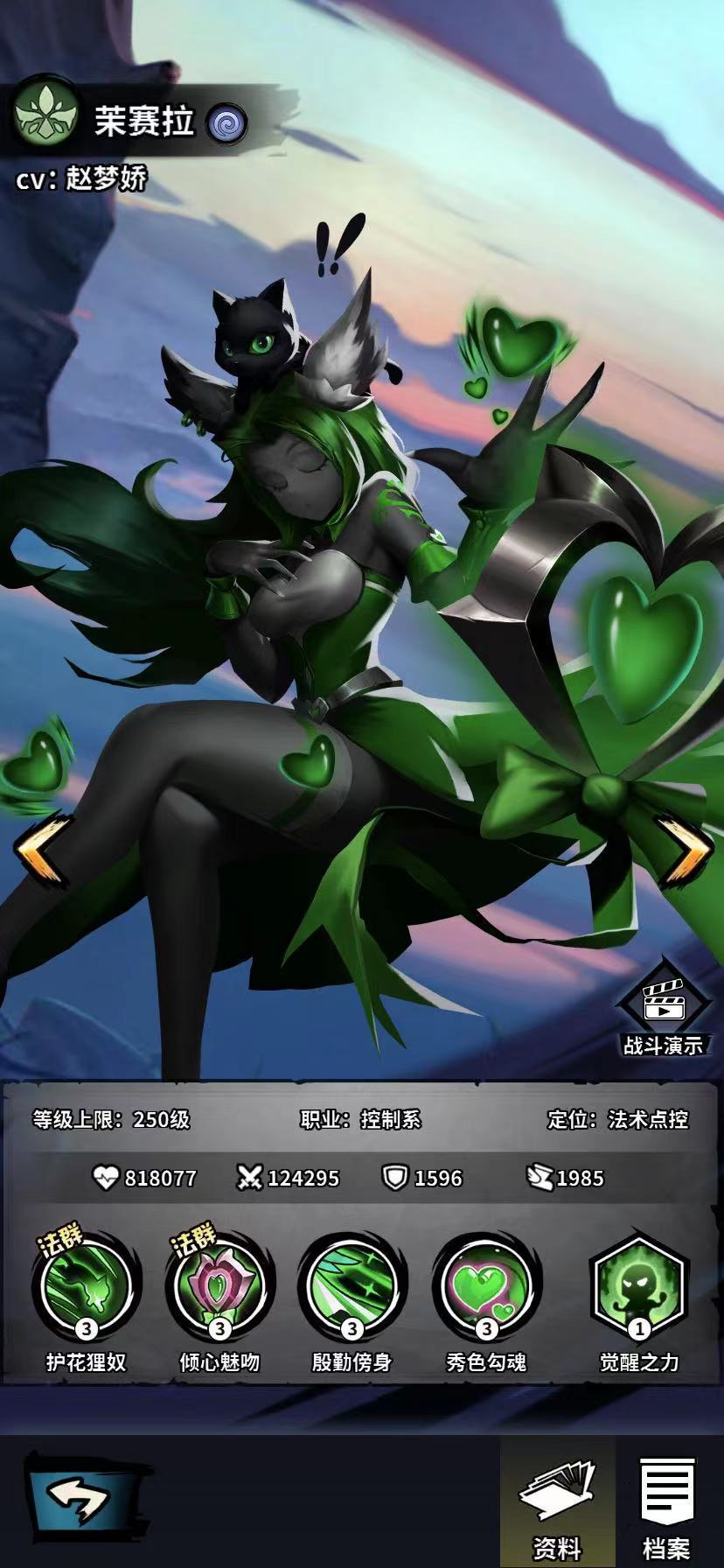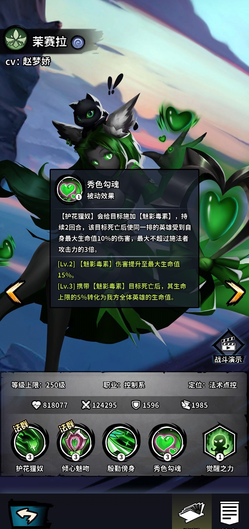 茉赛拉剩下的两个技能都是被动技能,不需要手动释放的,三技能殷勤傍身可提升茉赛拉20%的攻击力以及10%的生命值,至于4技能秀色勾魂则是可以在发动攻击的时候对目标多施加一层魅影毒素,可以让敌方持续掉血,属于一个非常强势的消耗型技能。