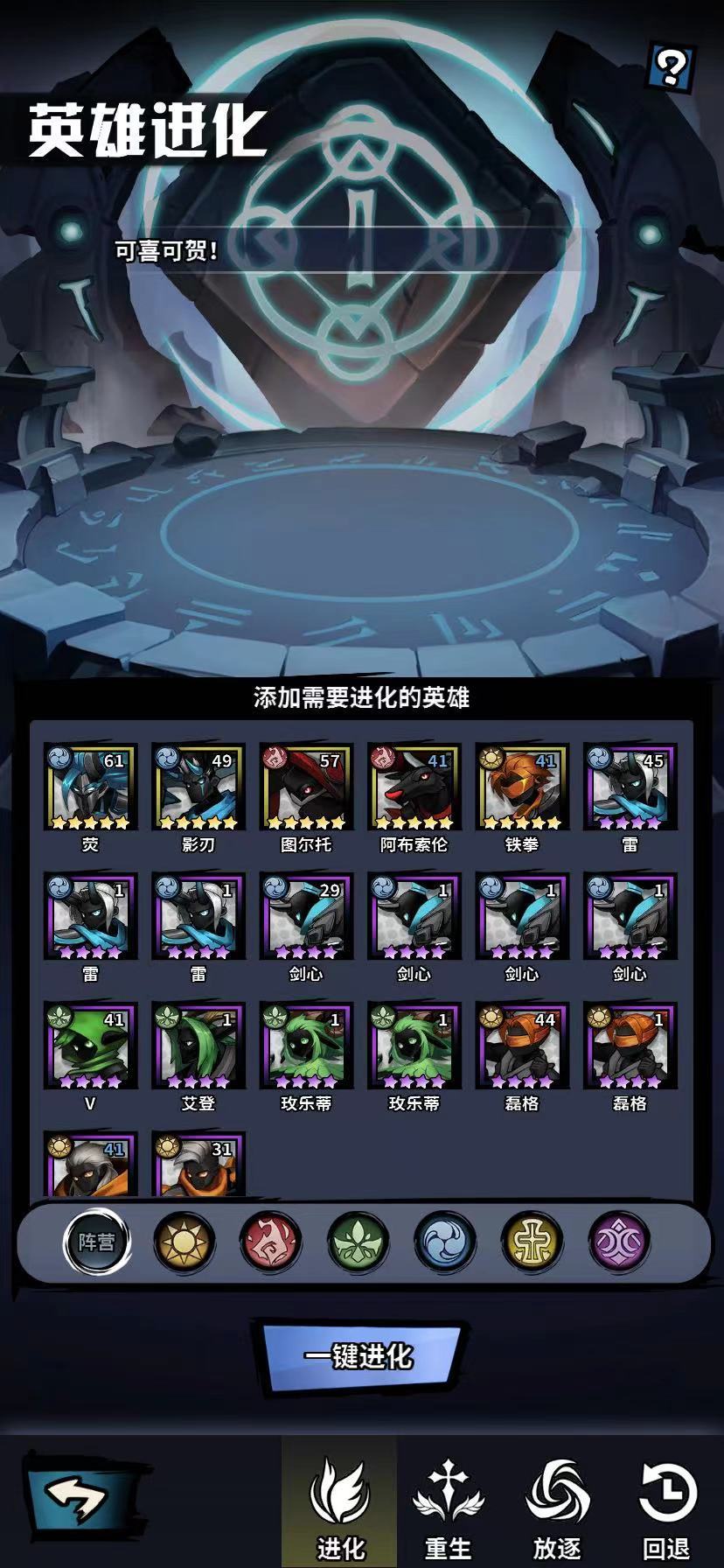 目前游戏内想要给英雄进行分解的方法只有两种,第一种是手动操作,这个就比较麻烦了,玩家在获取到英雄之后可以在我的英雄界面查看自己所有的英雄,选出一些用不上的英雄将其放置在营地界面的命运法阵内,命运法阵一共有4种玩法,分别是进化,重生,放逐以及回退,其中放逐就是分解英雄的场景。