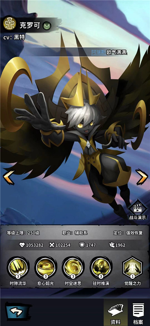 克罗可是神恩降世阵营英雄,也是目前游戏中最强的治疗系英雄,不信我们就来看看他的技能,首先是时隙流华,1级的时候为友方生命比例最低的3个目标恢复攻击力73%的生命值,3级时候还会将治疗量的20%转化为攻击力;愈心韶光为我方最低生命值的队友恢复生命值,并附加救赎效果;时空迷思是增加自身的生命值和攻击力,是一个保命的技能;驻时推演是一个增伤技能;觉醒之力被动效果是全队生命值比例低于50%的时候发动,在4回合内提升治疗效果。从以上技能就可以看出克罗可的治疗实力了,不愧是最强奶妈。