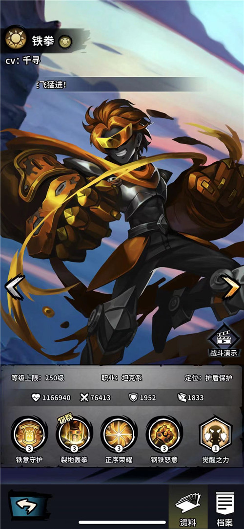 铁拳的前排能力也是非常好的,他擅长的是护盾保护,拥有者全部英雄中最高的生命值。技能铁意守护,可以保护生命值最低的队友,分摊目标受到的伤害;裂地轰拳攻击对方前中排,并为我方前中排释放护盾,吸收伤害。这样的一个舍己为人的前排坦克能不好吗?