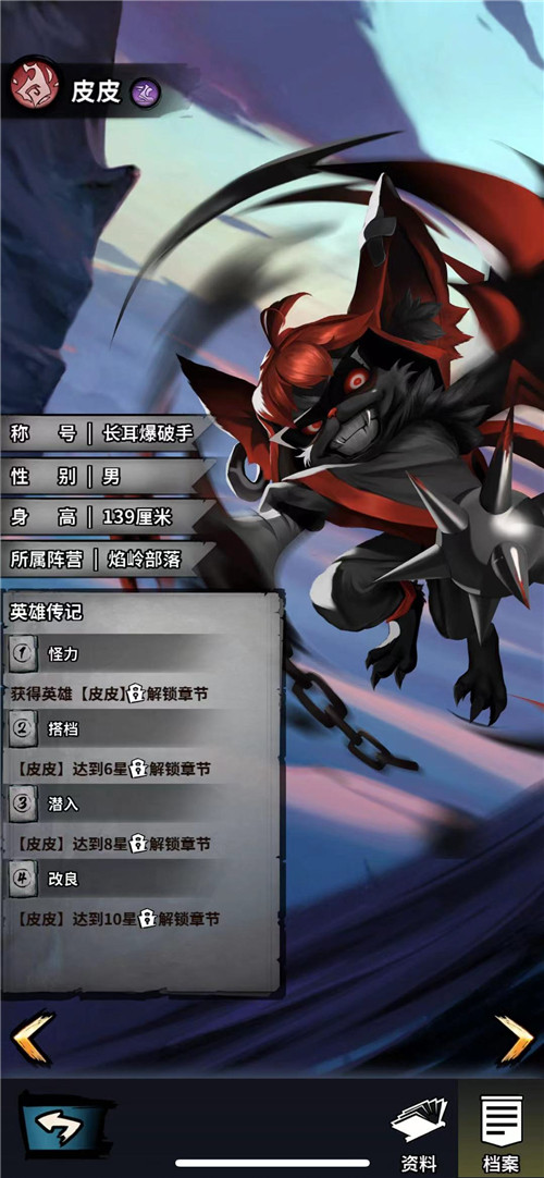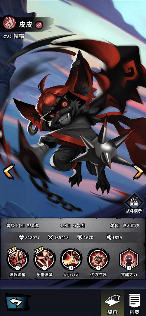 皮皮在游戏中是一个五星传奇英雄,职业强攻系,定位法术燃烧,此处可以看出他具有一定的持续伤害效果。下面看看他的技能解析:
