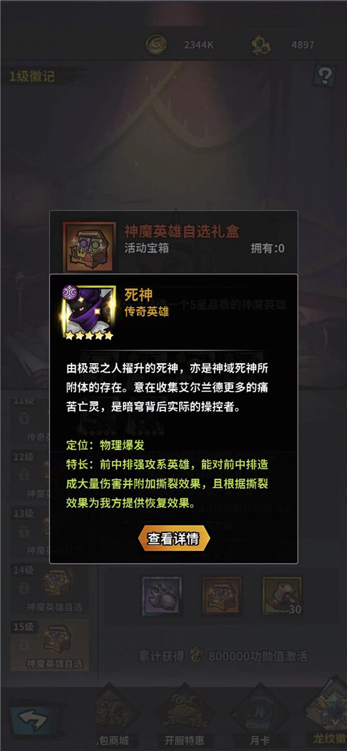 1、玩家可以通过升级龙纹徽记至15级(需8万RMB),会赠送一个神魔英雄礼包,玩家可以在礼包中选择一名英雄,其中就包括死神。