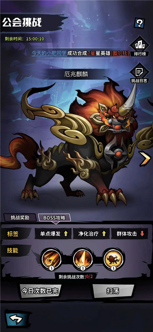 BOSS技能:裂魂暗爪对中排2个目标造成物理伤害,并偷取目标一定的攻击和防御;天怒硫陨必杀技对敌方全体造成物理伤害,并有概率附加流血效果;混沌意志被动,免疫控制,每受到5次攻击就对敌方前中排造成物理伤害。
