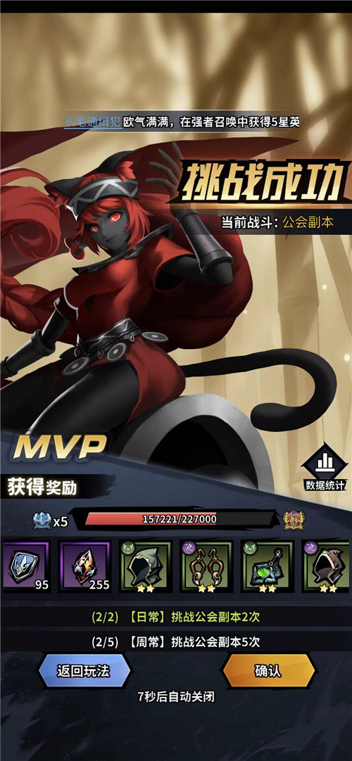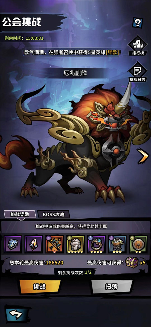 公会试炼BOSS每日可以挑战2次,累计挑战10次之后可以开启扫荡,这样就很节约时间了。挑战成功之后可以获得不错的奖励,包括公会币、星辰精华、6星武器、5星武器、4星武器、3星武器等。造成伤害越高获得的奖励越丰富。全公会最高伤害还可以获得5个宝箱奖励。