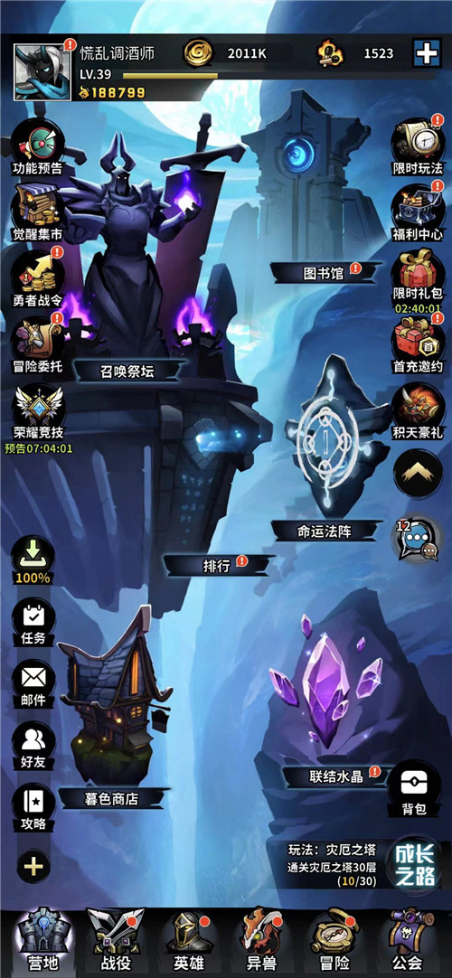 之后就根据游戏的提示不断推本做任务,开放更多新玩法之后,每天就要记得去刷,多积累一些召唤券,每天都去十连,没有召唤券就用火柴,英雄越多中后期阵容选择越广泛。最后找个好的公会,在公会中要积极的参与活动也能混到不少好处。