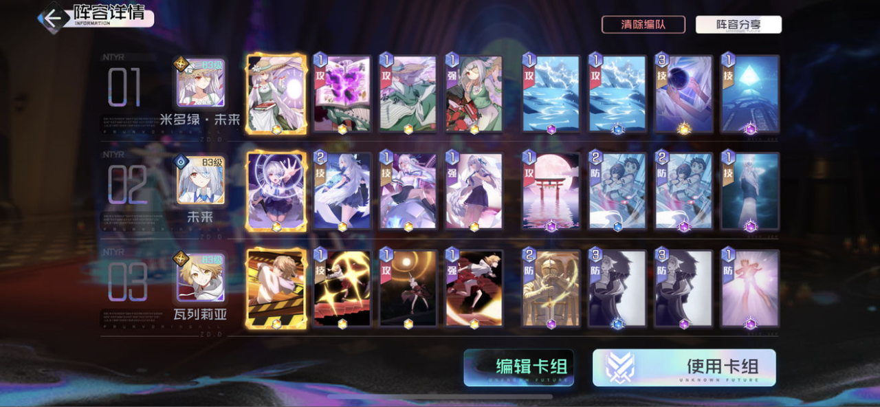 (3)辅助角色:输出角色推荐使用未来,选带卡牌推荐使用绝对防护两个、樱落一个、救援一个。