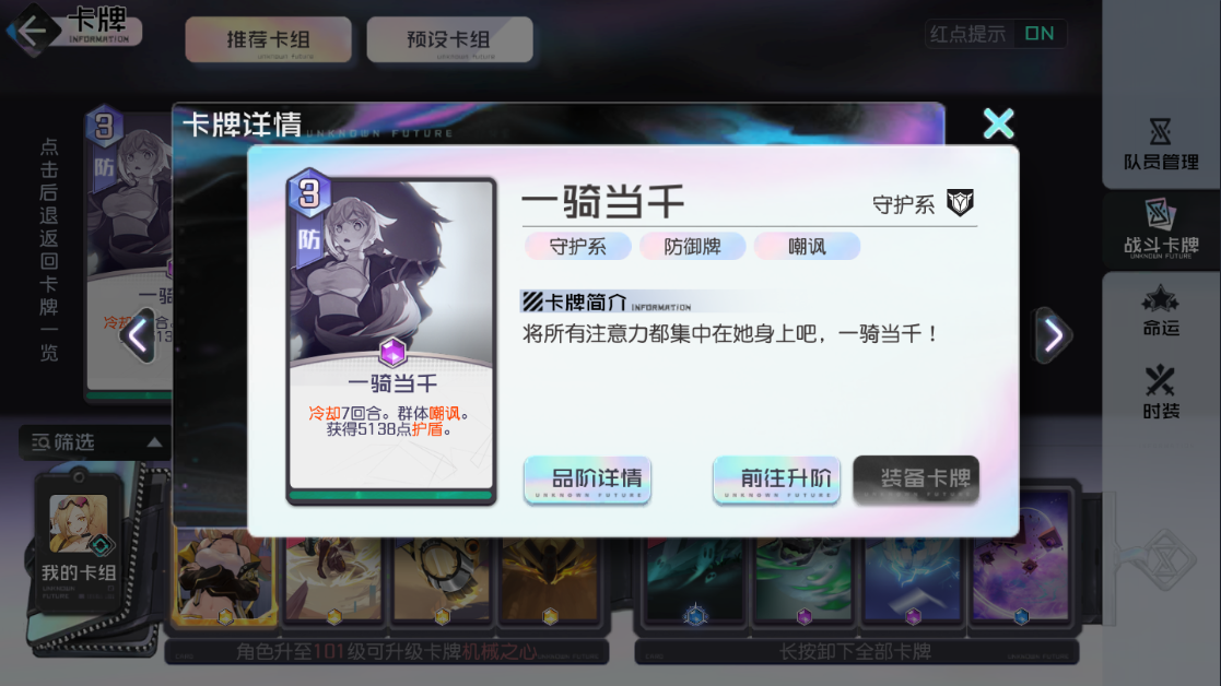 (3)防御角色:卡牌建议携带末日余晖一个、钢铁化一个、一骑当千两个。