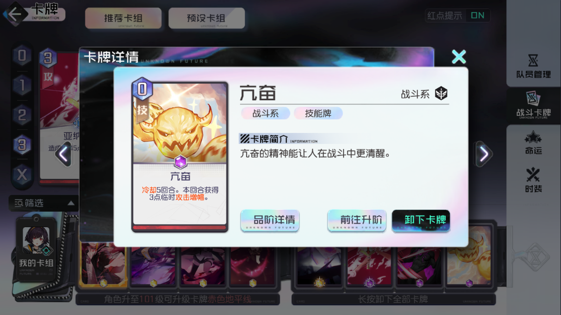 (1)攻击角色:卡牌建议携带亢奋两个、回旋斩一个、万能兵装一个。