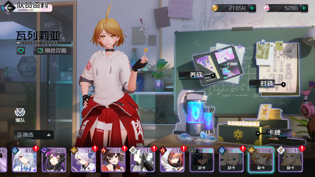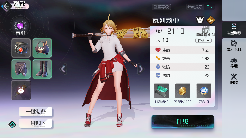 第一名瓦列莉亚,玩家从新手时期就会开始培养的角色,防御能力出众。依靠“我身作盾”的卡牌,可以嘲讽大量敌人攻击自己,完美的保护好队伍当中的输出角色。其特色为大技能“本垒打”,对敌人造成伤害的同时,还会为自身提供一层护盾保护。