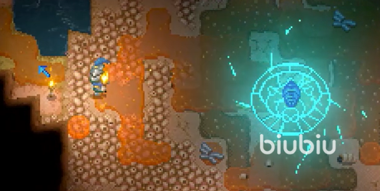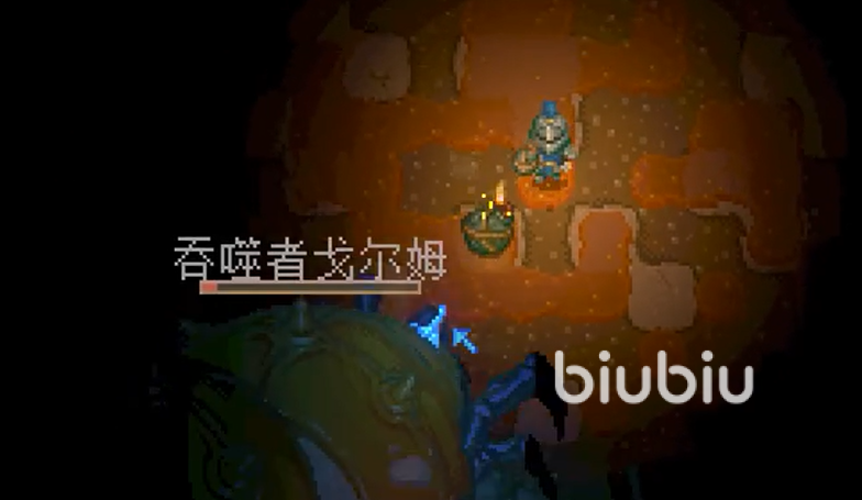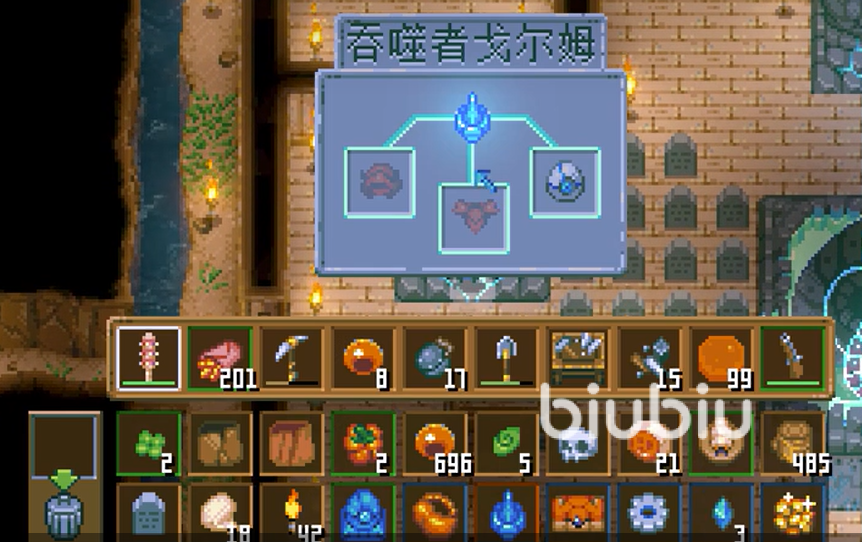然而,获得探测器并不是一件简单的事。首先,你得打败游戏中的初始挑战——大史莱姆。这个体积庞大的黏液生物会掉落一个重要的道具:蓝色水晶。把水晶放入大史莱姆雕像内激活后,在工作台上便可制造出吞噬者探测器。材料收集起来并不困难,所以建议在砍下大史莱姆之后立刻行动。
