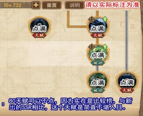 这里就非常容易加点了,所有一点满即可。原本因为技能点比较少,因而之前八十天赋不筹划点的,而且这个八十天赋是的确太优良了,即使是本来减伤也是不错的,可实际上却是为身后搭档分担伤害,或者是只有1格。相对新出的SSR,这个天赋称之为最差一档,没有什么特别之处。