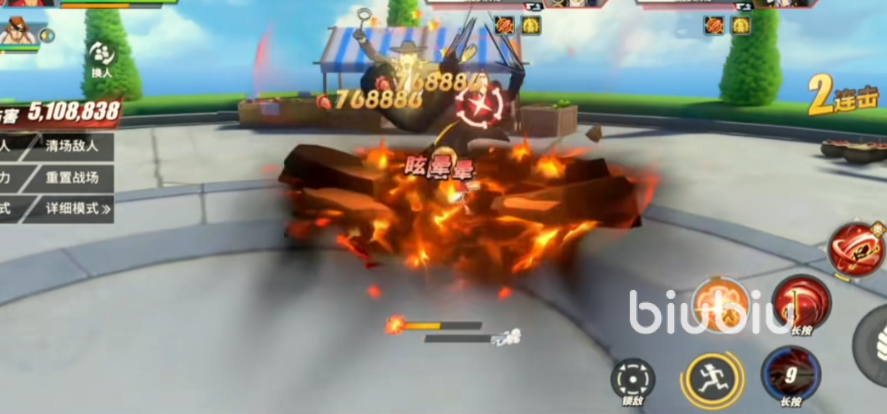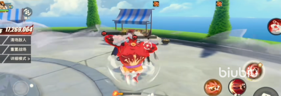 三挡技能:使用大手发动旋转攻击,长按可释放“橡皮·怪鸟枪”,从高处使用大手发动强力打击。“橡皮·橡枪乱打”,从较高处利用大手对敌方进行连续打击。“橡皮·巨人之鞭”:使用巨大化的脚横扫攻击敌人。“橡皮·巨人雷斧”:将巨大化脚伸入云层中利用雷电放出巨人之斧。