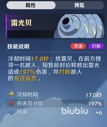 雷光贝冷却时间同样是17秒,放置使用,它会自动在前方搜寻敌人,在经过短暂延迟后释放雷光造成打击,并干扰敌人的攻击,这算是一个提前锁定类的,比较适合灵活类英雄使用。
