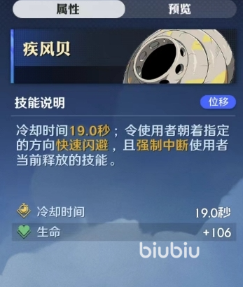 疾风贝冷却时间是19秒,使用后能让使用者想一个指定方向快速闪避,但期间会中断当前释放的招式,这个能帮助小伙伴们灵活躲避敌人的攻击,增加生存能力,适合绝大部分角色。