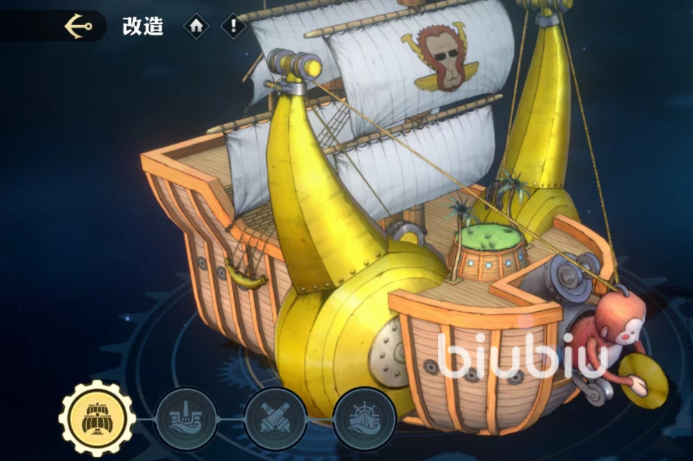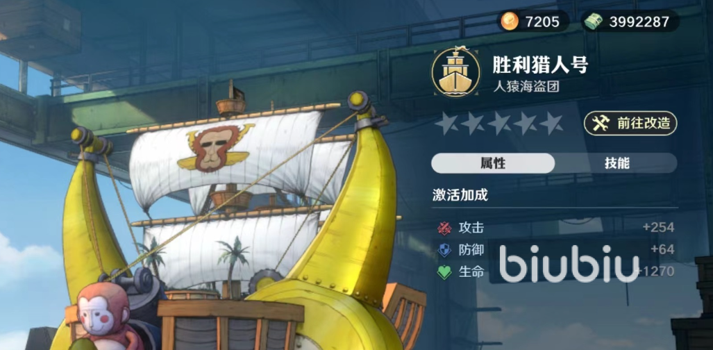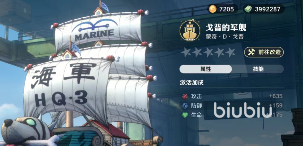 当我们打开主页中的船坞选项,就可以在这里看到我们所拥有的船只。然后每艘船都带有独特的技能,以戈普的军舰为例。一共带有两个船技,这时可丢出一枚硕大的炮弹并攻击向敌人,并且可以绕过所有地形直接击中对方。