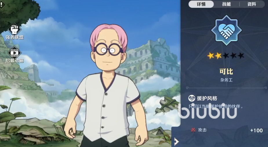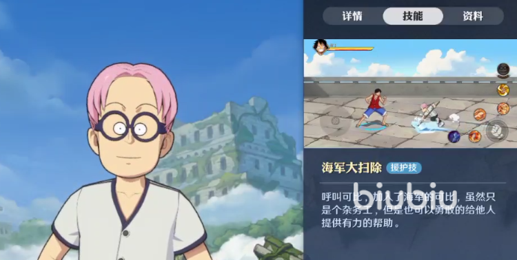 不过目前游戏里实装的还是早期的可比,刚加入海军不久,做着打杂的工作,因此战斗力有限,仅作为援护角色登场了,技能“海军大扫除”,挥动扫走往返攻击,是二段击。