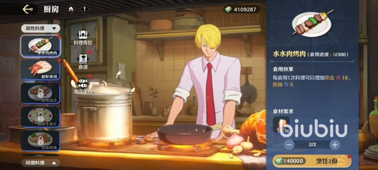 在厨房主页面的右侧,可以看到所有可以进行的料理图标,点击之后就能够查看一下当前所具有的属性和相应食材要求。满足食材后,点击烹饪就能直接制作成功,还可以一次性制作多份,这样减少操作时间。