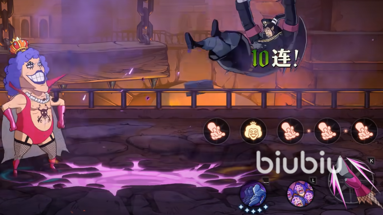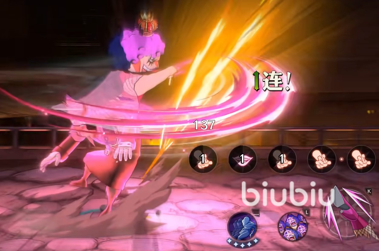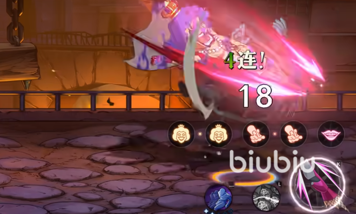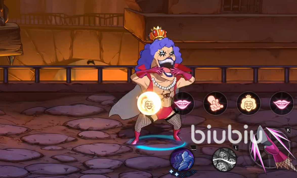 强化下会跳到空中进行两段大跳,空中旋转期间也可以闪避各种攻击,终极强化会直接变成女人的姿态连续打出两段空中连踢,他的奥义技会将敌人给包围,发射出威力巨大的死亡媚眼,他的终结技会进入到动画中,给对手献上一吻造成输出。