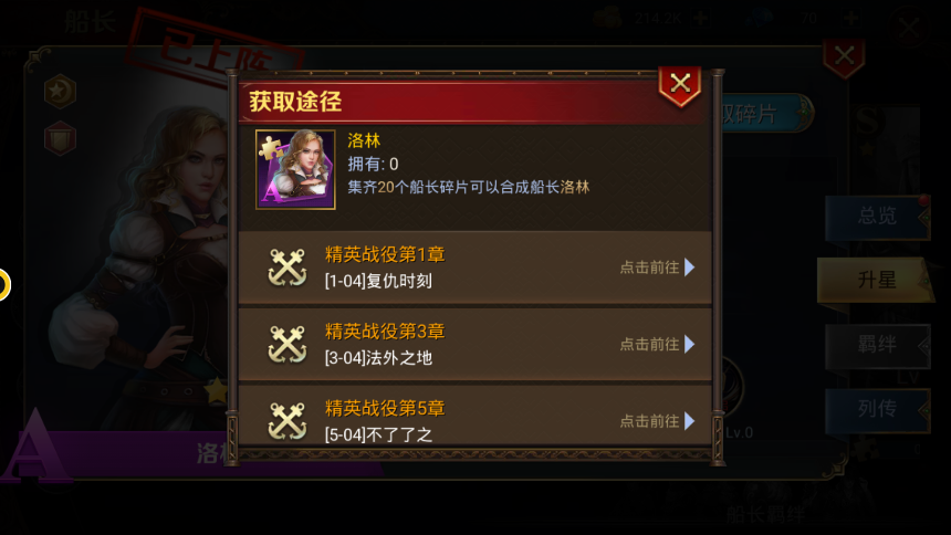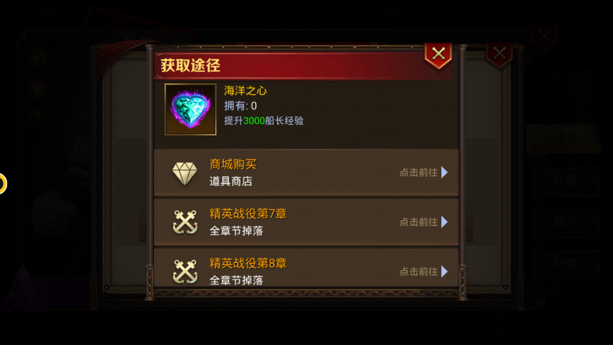 星级的提升相对于等级来说更难一些,主要使用到的道具是船长碎片,而且是对应的船长碎片,每次提升都需要30个碎片。