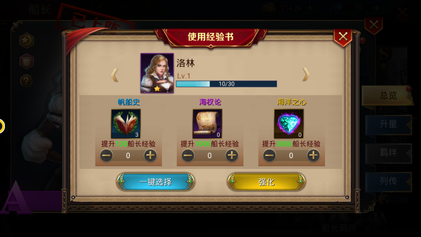 点击之后我们发现提升等级需要用到不少的道具,帆船史可以提升100点经验,海权论可以提升1000点船长经验,海洋之心可以提升3000点经验。