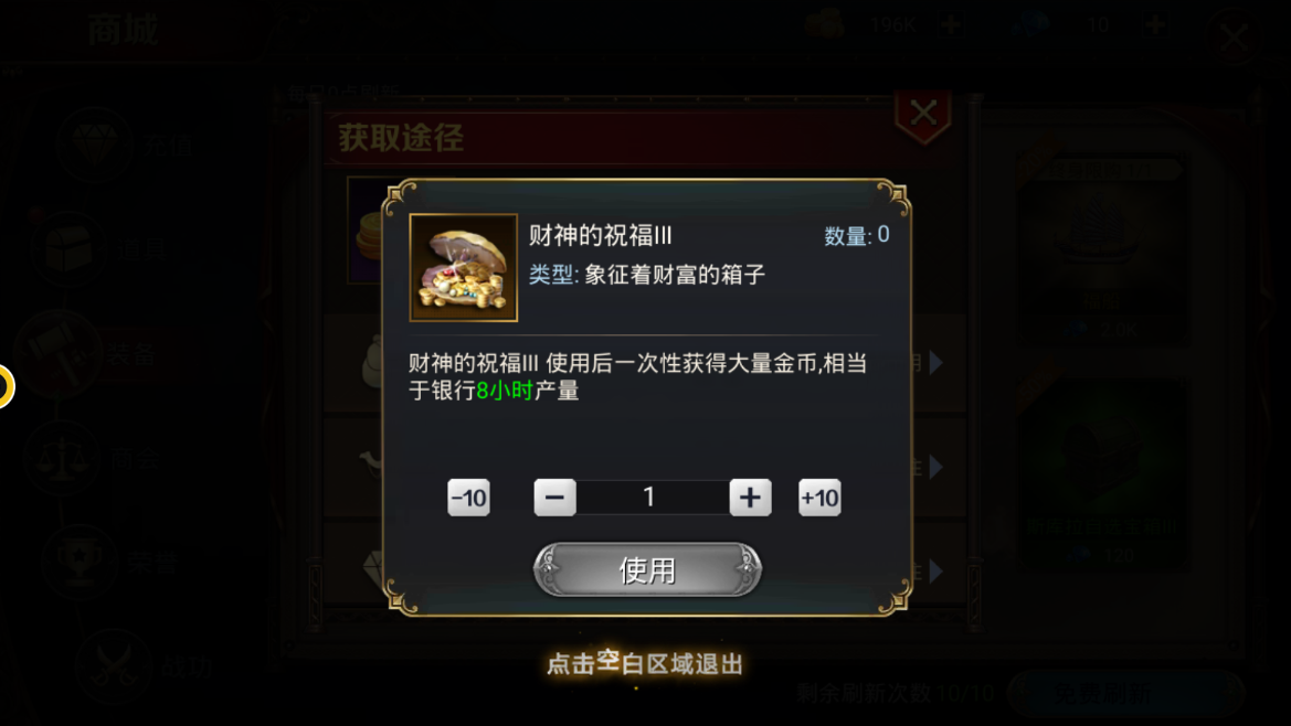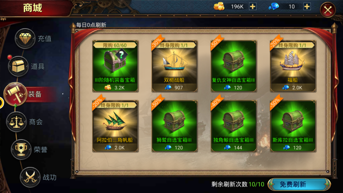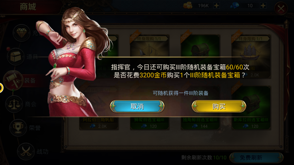 金币还可以用来购买装备,我们直接打开商城,然后选择装备选项,第一个就使可以使用金币购买的装备箱子了,可以随机开出不同的装备,每天限制购买60个,价格为3200金币。