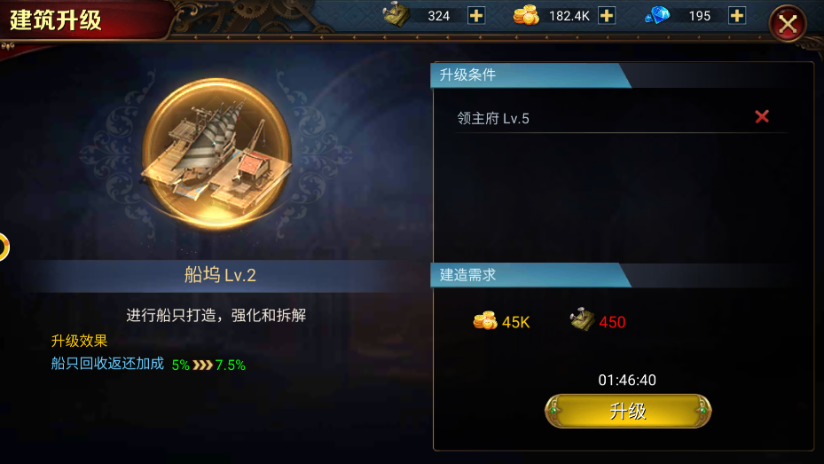 等级越高的船只需要的图纸越多,除此之外还需要造船木材与金币,这两个是通用的,可以多准备一些。