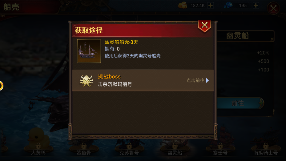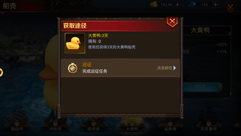 点击船壳就可以看到船壳附加的详细属性了,然后再点击前往就可以看到获取方式了,前五个船壳的获取方式是通过完成远征任务,这个任务需要15级才可以开启,而且任务线不算短,做完还是需要一定的时间的,也是必做的任务之一,所以前面五个船壳基本是一定可以获得的。
