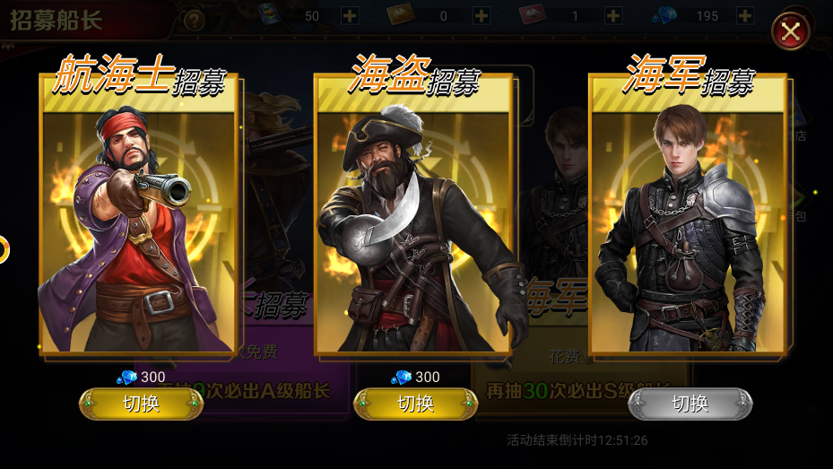 同时在招募界面还可以话费钻石切换卡包,因为卡包有三种不同的类型,分别是航海士,海盗,海军,不同的卡包招募出来的船长是不一样的,可以根据自己喜欢的船长换卡包召唤。