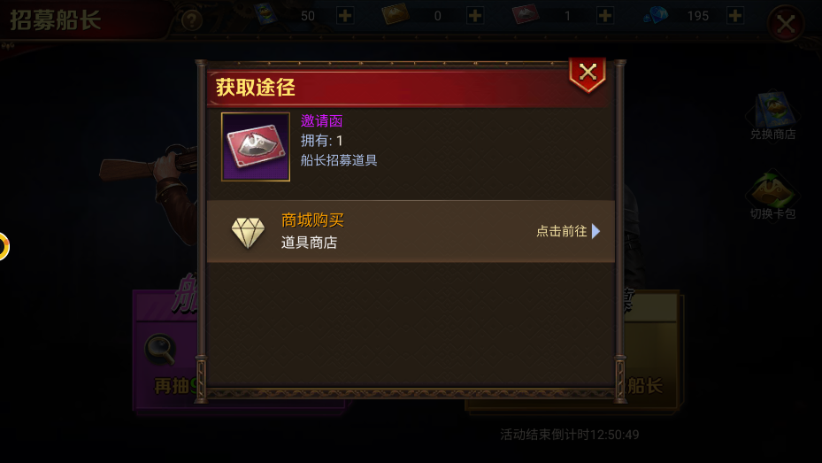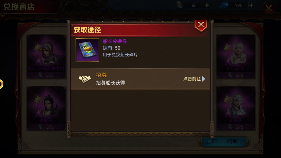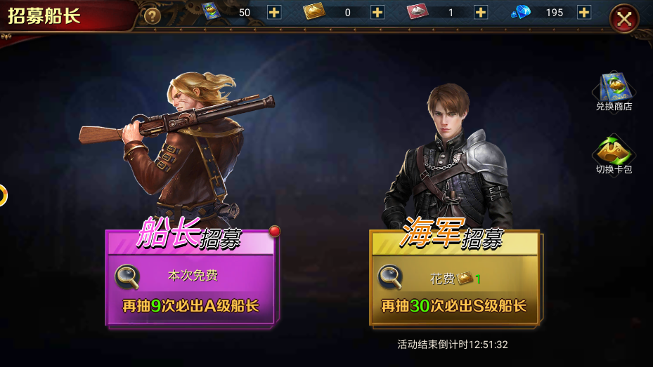 在招募界面,我们可以看到兑换商店,我们每次招募都可以获得额外的船长兑换券,在兑换商店中就可以任意兑换我们需要的碎片,碎片的主要作用就是强化我们的船长。
