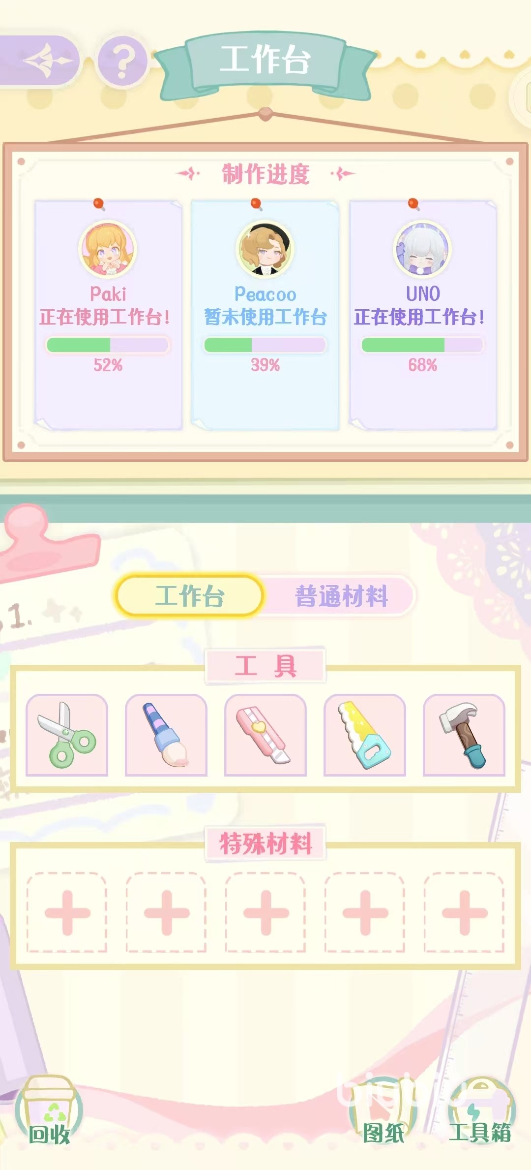 在使用的时候需要先装入工具,并准备好足够的用于制作的材料后,游戏中的三个伙伴,也就是paki、peacoo和uno这三个,就会在随机时间利用工作台去制作出一些道具。制作这些需要先学会相应的图纸,在游戏商城中就可以直接购买到这些图纸,没有图纸是无法制作出道具的。游戏中的工作台有三个等级,所有的解锁都需要花费游戏内货币,解锁需要从上到下进行,一些单独的项目也是可以单独解锁的。所以这里不需要全部解锁,大家根据自身的需求和手中的货币数量去选择常用的项目就可以了。
