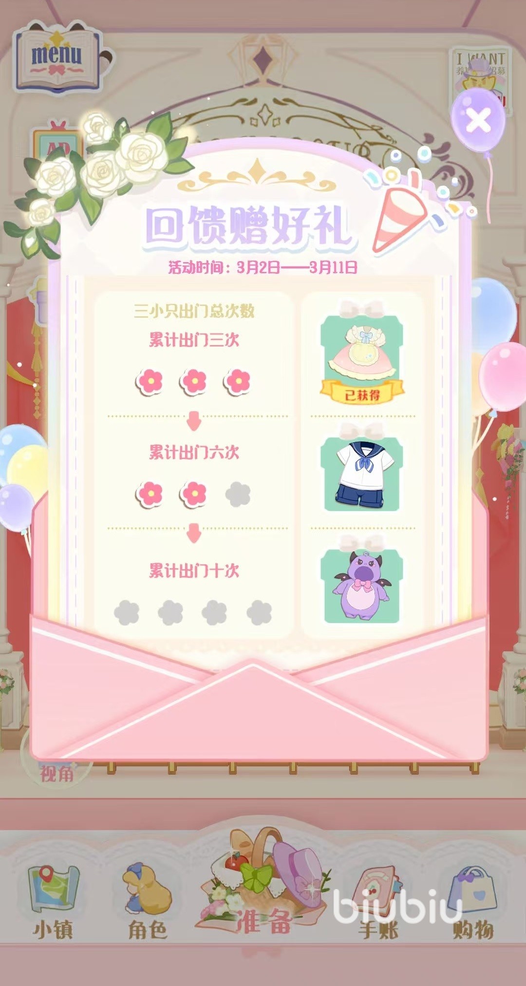 在游戏中出行是很重要的玩法,玩家需要在商城中购买食物和出行道具,然后给三小只的背包中放进去之后,他们就会在随机时间出门旅行。背包中放置的不同食物,将决定路程的远近,不同出行道具可以提高到达目的地的概率等,但是何时出行,何时回来,完全要看三小只们自己的心情,玩家是无法进行干预的。他们去过的地方会自动解锁地图,这样可以判断有哪些地方去过以及打卡记录。