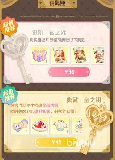 在游戏的氪度上,首要介绍的就是月卡的内容。月卡分为了【银之钥】和【金之钥】,金钥匙月卡带来的道具奖励会比银钥匙月卡的内容多很多,而且还能直接把角色等级提升10级,如果想要冲月卡的话建议还是直接冲金钥匙。