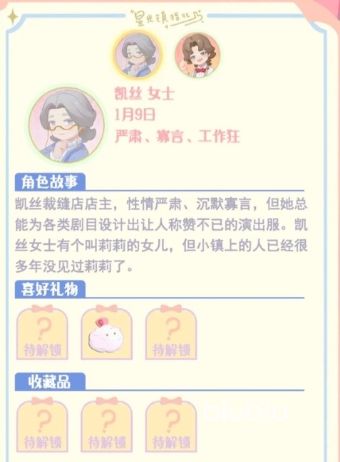 2、凯丝太太:她是裁缝店的店主,她性格比较严肃而且比较低调,她比较喜欢蝴蝶胸针、手机挂件;如果送的礼物凯丝太太喜欢的会回礼【缝纫机】。