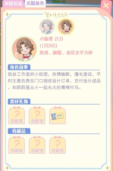 3、刀刀:她是裁缝店里的小助理,她就比较热情幽默了,但是她话比较多。她就会比较喜欢戏票票根、新书优惠券;