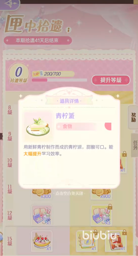 一般来说我们需要通过做任务提升匣中拾遗的等级,当你的等级满了之后,就可以不需要再做任务,并且能够领完所有的奖励。其中的奖励就包括青柠派,这是一种用新鲜青柠制作而成的食物。口感非常酸甜可口,如果给角色准备的话,就可以大幅度提升他们的学习效率。