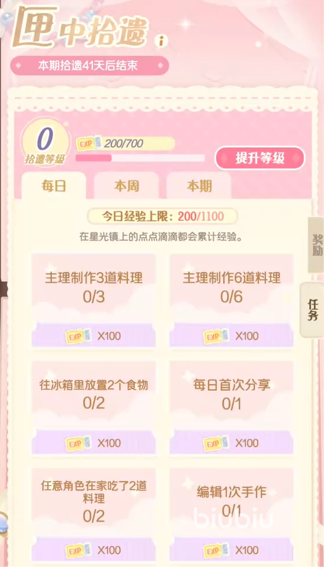 然后也可以获得记事本—表演,当角色携带外出时,就能够让他更好地学习表演,提升技能学习成功的概率。不过每周可以获得的经验有限,所以我们并不能一蹴而就。还需要每周做完所有任务,才能更快拿到等级奖励,例如制作三道料理。