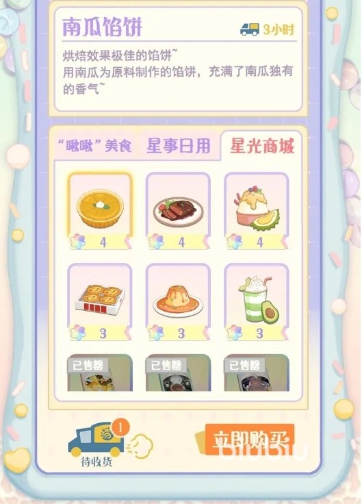 在星光商城中购物也是游戏中很神奇的体验,如果是购买食材道具的话会直接出现在仓库中,如果是购买家具或者是三小只的服装的话,不是直接到库的,而是通过在主界面中签收快递来获得道具的。