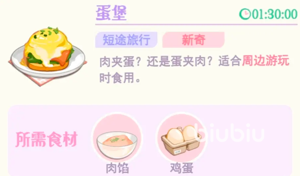 要是想要制作的蛋堡,那就先需要先准备好食材,其中就包括鸡蛋以及肉馅。鸡蛋的话,获取难度很低,只需要在商店中直接购买就行了;然后肉馅就需要再进行加工,需要先准备好猪肉,并且用相应的器材将其搅碎,然后就可以形成一份肉馅了。
