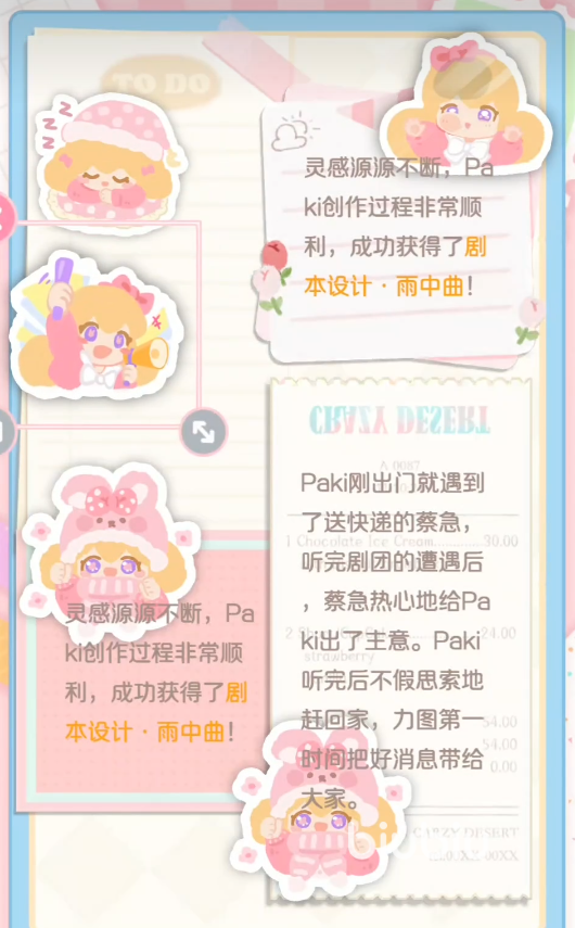 要是大家打算跳舞的话,那么一定要让自己的角色参与演出。玩家可以安排三位小演员(Paki、Peacoo、UNO)排练并演出各种剧目,部分剧目可能包含舞蹈动作,例如《雨中曲》《罗密欧》等经典戏剧改编。