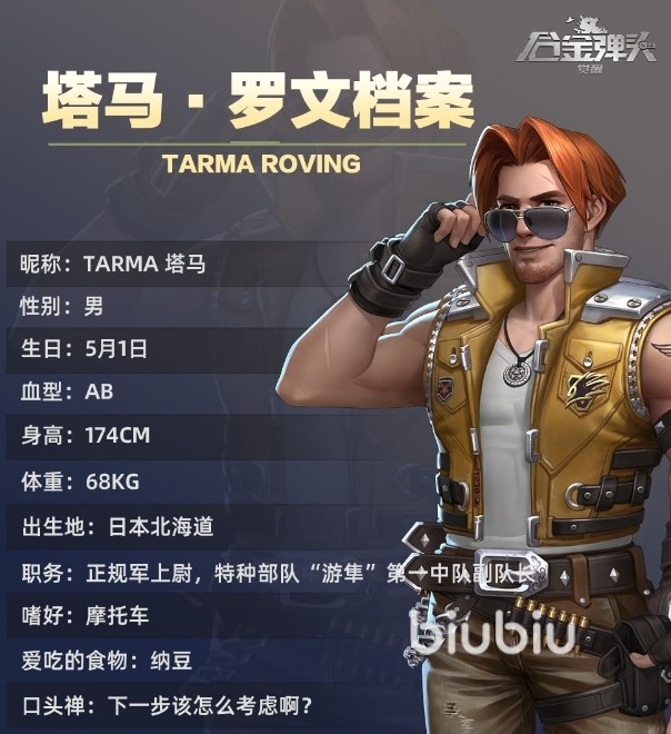 塔马罗文在游戏内的定位是特战型角色,作为军事家庭出身,他拥有着非常不错的军事理论和技巧,而且也参与过正规的军事训练,专业能力还不错,而且还会改装摩托车,技能一共有两个。第一个技能是回弹扳手,这个技能是一个单体攻击技能,可以向敌人投掷扳手,直接造成大量伤害数值,而且在扳手反弹回来之后,如果塔马能够接住,那么则可以直接触发第二轮伤害,为摩托式炸弹,可以直接骑着摩托进行冲锋,对沿途的所有敌人进行攻击,拥有高爆发的伤害数值。