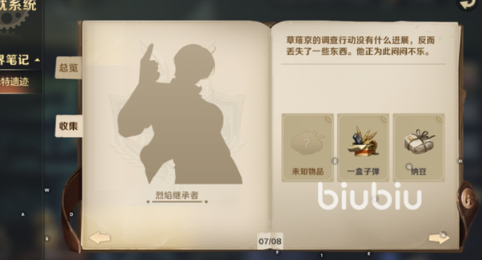 另外,游戏一个不错的地方是,游戏的世界观联动方面做的相当不错。比如说隔壁草稚京在游戏中也有相应的收集要素,像子弹,纳豆等等,具有其角色特色的收集成就要素,玩家们可以在笔记遗迹进行查看。
