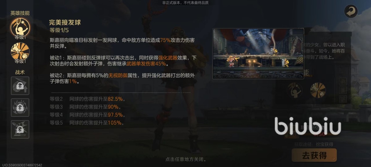 斯嘉丽在身后召唤一个发球机兵,发球机兵玩法类似炮台,会在场上发射多发强力网球,每次命中敌方单位时造成150%攻击力伤害。当斯嘉丽将反弹的网球再次击出可以获得强化效果,提升武器的攻击力。
