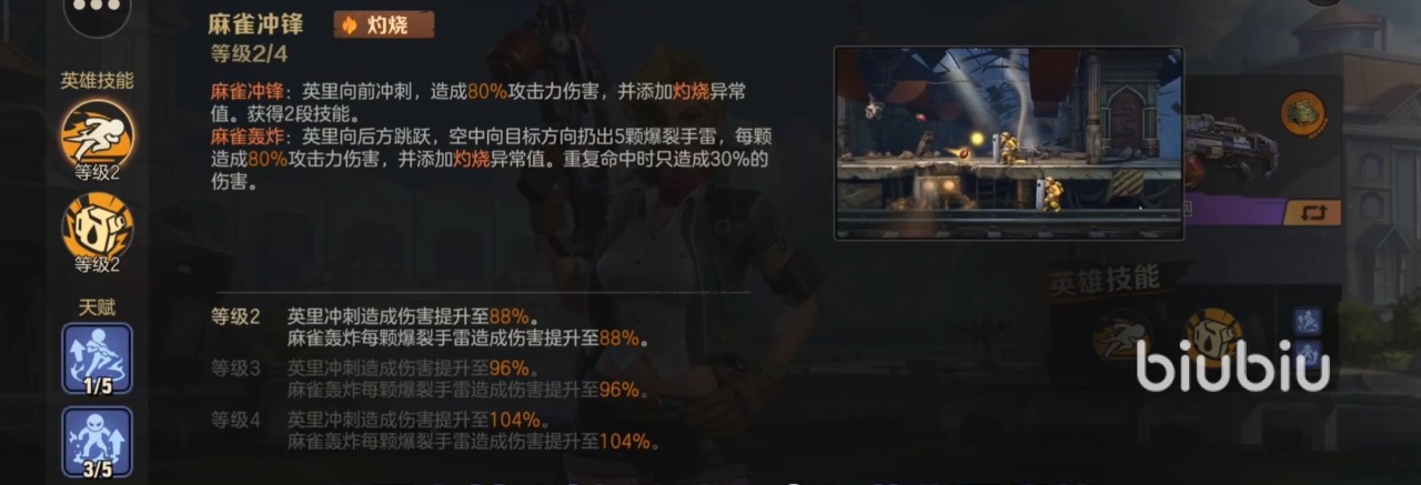 游戏里的笠本英里有两个技能,一技能是小招,叫做【麻雀冲锋】,该技能是二段技能,首先笠本会向前进行冲刺,对敌人造成80%攻击力伤害,并给他们增添上灼烧异常值。这时候就会获得二段技能,二段技能是名为【麻雀轰炸】,笠本会朝着后方做出跳跃的动作,进而从空中向目标方向投掷出5颗爆裂手雷,每颗手雷可以造成80%攻击力伤害,同时,给敌方目标添加灼烧异常值,如果重复命中一个目标的话,那么造成的伤害就只有30%了。