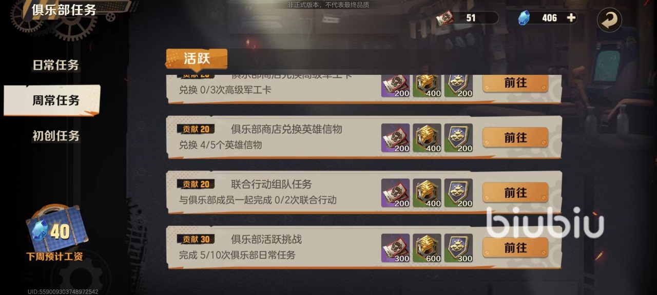 俱乐部的周常任务有也是有4个,第一任务是在俱乐部商店兑换三次高级军工卡,军工卡兑换需要200点俱乐部点券,这个数量并不少,需要大家积极参与俱乐部活动才能获得足够的俱乐部点数;第二个在俱乐部商店兑换5点英雄信物,英雄信物需要的点数也是200点一个,所以要完成周常任务需要的俱乐部点数还算比较多;第三个是与俱乐部成员一起两次联合行动,这个比较简单,直接找个成员和我们组队就好了;第四个任务是完成10次俱乐部日常任务,10次日常任务,大概需要完成2次所有的日常任务就好了。每周完成所有的周常任务可以获得60点的个人贡献值。