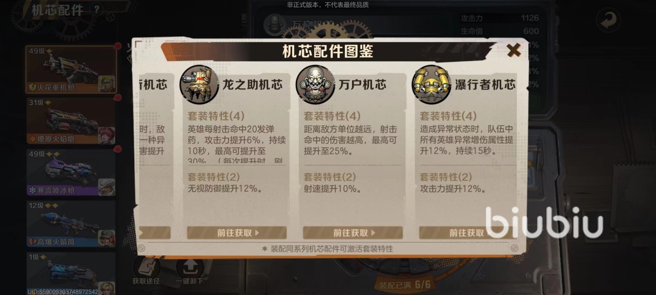 龙之助机芯的效果是每射击命中20发弹药,可以提升6%攻击,龙之助机芯搭配高射速武器,有非常不错的攻击收益,而马可的主武器重机枪同样是高射速武器,对该芯片适配性很高。